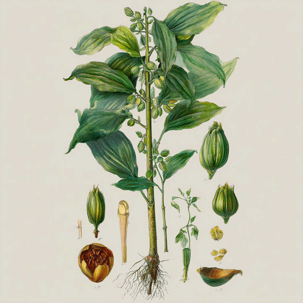 O cardamomo vem das sementes da planta Elettaria cardamomum, da família das Zingiberaceae — a mesma do gengibre e da cúrcuma. Nativo das florestas tropicais úmidas do sul da Índia e do Sri Lanka, cresce em áreas sombreadas, com solo fértil e clima quente.