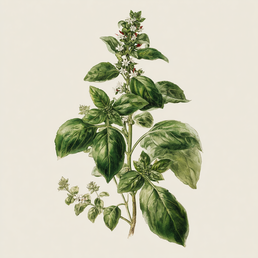 Originário da Índia e do Sudeste Asiático, o manjericão era cultivado há milênios em templos hindus, consagrado ao deus Vishnu. Considerado planta sagrada, não era colhido com tesoura — mas com as mãos lavadas e orações nos lábios.